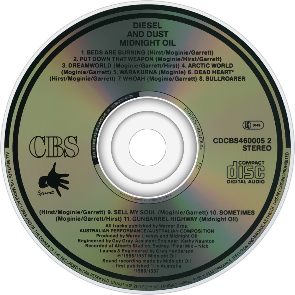 Diesel and Dust is the sixth studio album by Australian rock group Midnight Oil which was released in August 1987 by Spirit Music label under Columbia Records. Diesel and Dust was produced by Warne Livesey and the band. It is a concept album about the struggles of Indigenous Australians and environmental causes, issues important to the band. It drew inspiration from the Blackfella/Whitefella Tour of remote Indigenous communities with the Warumpi Band and Gondwanaland in 1986. The album peaked at No. 1 on the Australian Kent Music Report Albums Chart for six weeks.