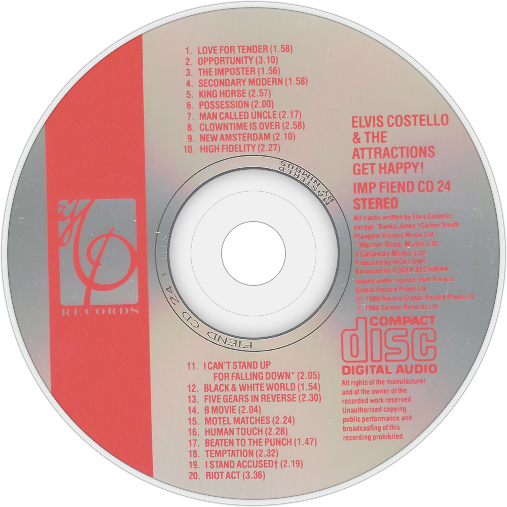 Get Happy!! is a studio album by Elvis Costello and the Attractions. The fourth album by Elvis Costello, his third with the Attractions, it is notable for being a dramatic break in tone from Costello's three previous albums, and for being heavily influenced by R&B, ska and soul music. The cover art was intentionally designed to have a "retro" feel, to look like the cover of an old LP with ring wear on both front and back.