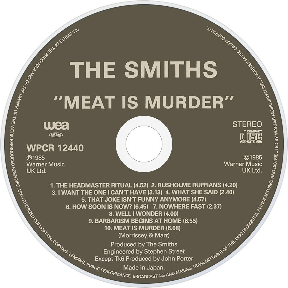 Meat Is Murder is the second studio album by the English alternative rock band The Smiths. It was released in February 1985 and became the band's sole number one album in the UK charts during the band's lifetime, staying on the chart for 13 weeks. It reached number 40 in Canada and number 110 in the US. In 2003, the album was ranked number 296 on Rolling Stone magazine's list of the 500 greatest albums of all time.