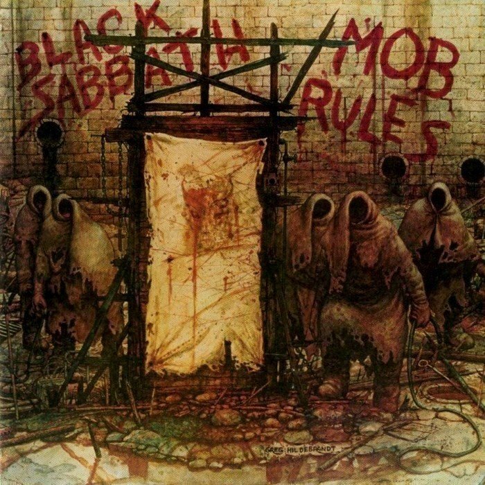 The cover art is a modified version of artist Greg Hildebrandt's piece entitled Dream 1: Crucifiers from 1971, with Black Sabbath licensing its use for the cover of Mob Rules. The original artwork has been augmented for the album, where not only have the band and album names been conspicuously added to the back wall, but also the hook hanging on the left side of the structure was changed to a crucifix, and the stain in the middle of the structure has been altered to resemble a devil's head. Lastly, Greg Hildebrandt's name has been added to the bottom center of the piece, as the original was rectangular in shape with the artist's name and year in the lower left corner, thus being truncated in the album's square presentation. The lyrical themes are dark, notably on tracks such as "The Sign of the Southern Cross" and "Falling Off the Edge of the World".