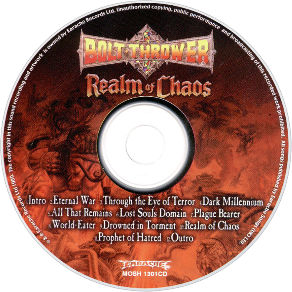 Realm of Chaos, subtitled Slaves to Darkness, is Bolt Thrower's second studio album, recorded at Loco studios in April 1989, engineered by Tim Lewis. It was mixed at Slaughterhouse Studios in July 1989 and engineered by Colin Richardson. It is produced by Bolt Thrower and Digby Pearson. The cover art work is produced by Games Workshop. The whole album is closely tied to Games Workshop's Warhammer 40,000 game background and Realm of Chaos: Slaves to Darkness was the title of a gaming book by Games Workshop released in 1988.